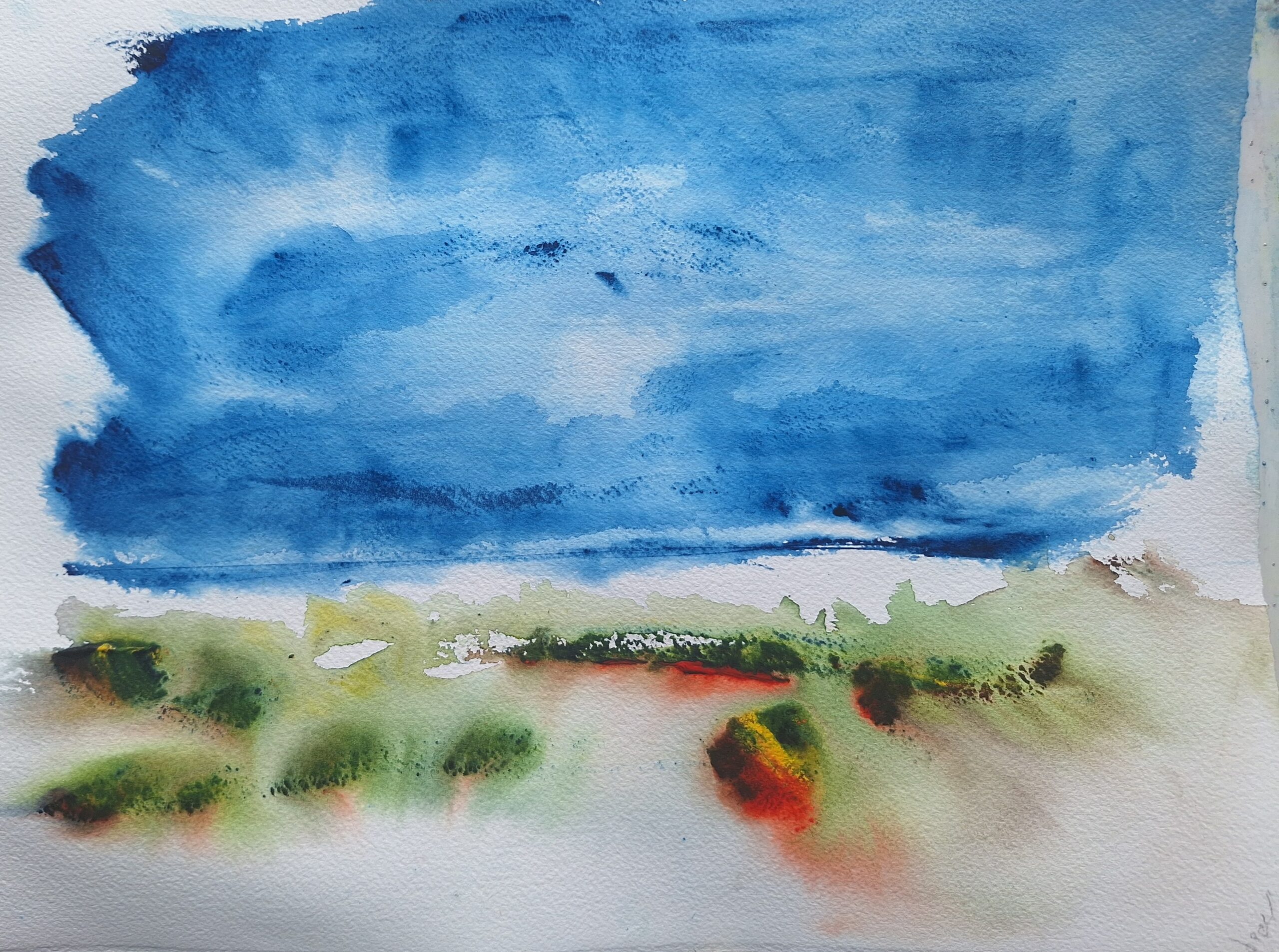 Layers of soft blue haze settling gently over the land, grounding the sky’s calm whisper into the earth below.