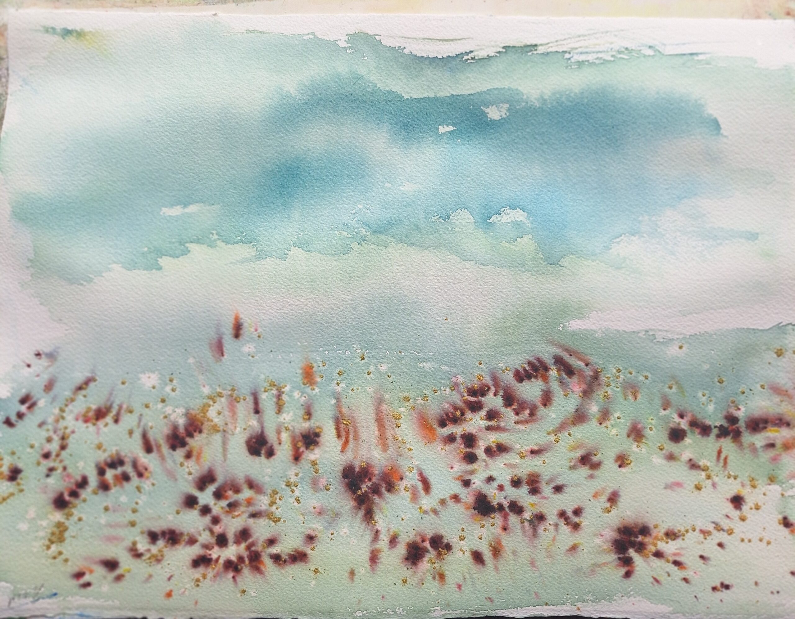A serene painting with soft skies and soft ground shrubs and hint of golden flowers